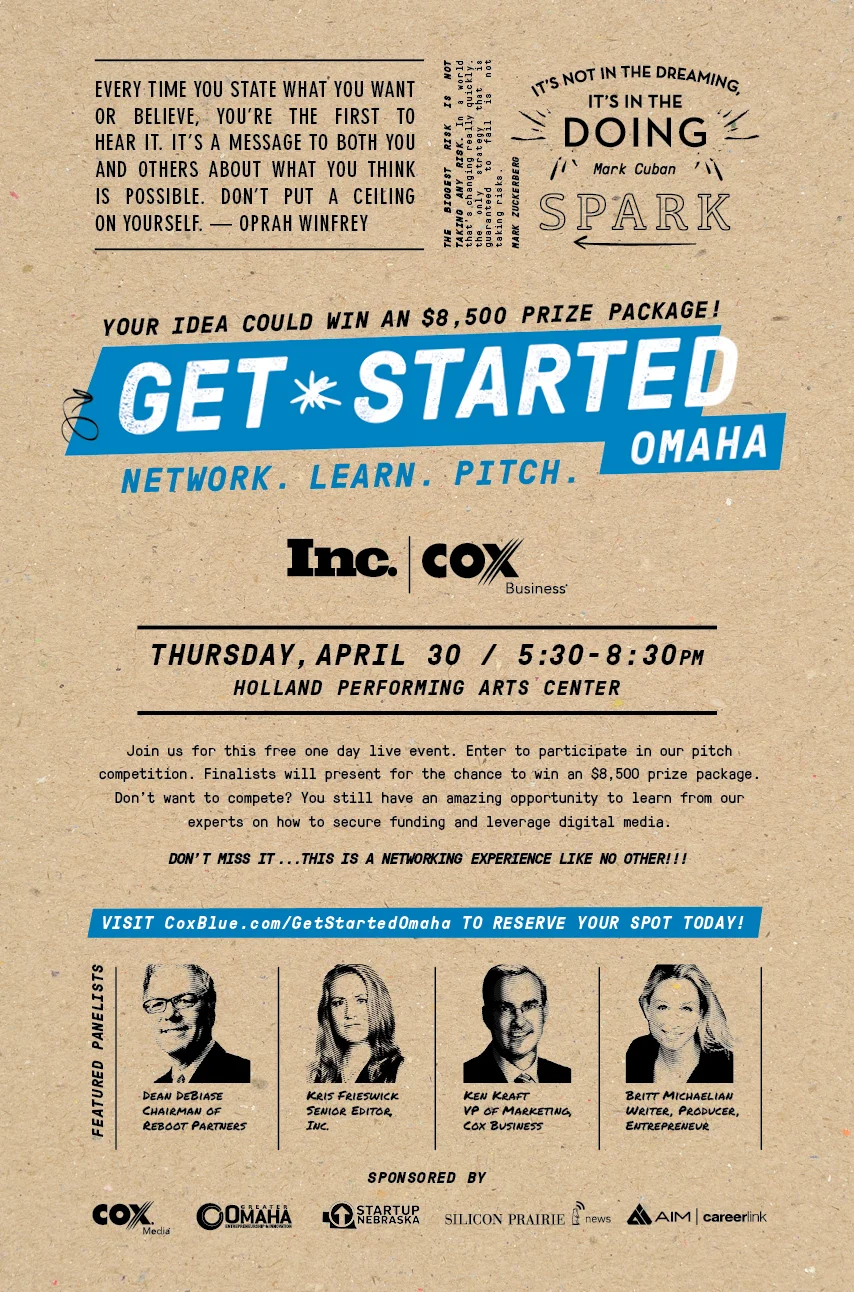 Get Started is a business networking and pitching event presented by Cox Business and Inc. Magazine. The scope of this project including branding, event marketing, collateral, display ads, and commercials spots. Our goal was to spread awareness for the event and to engage high level participants.